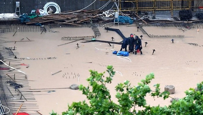 7月20日,工作人员在郑州市一建筑工地排水。图片来源:新华社