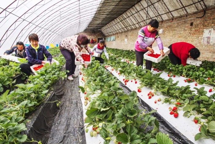 北京昌平区万德庄园工人在分级采收草莓。