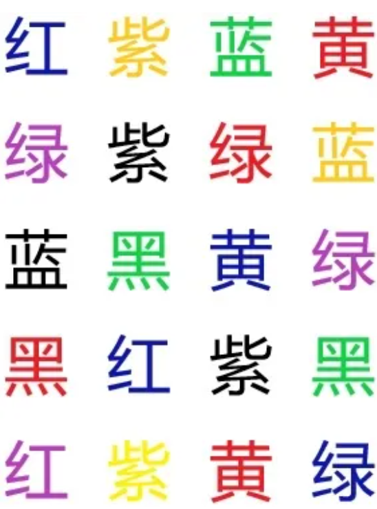 小伙伴们可以来试一试,如果让你尽可能快速地读出上面这些字的颜色(不是字本身),你会有什么感觉?
