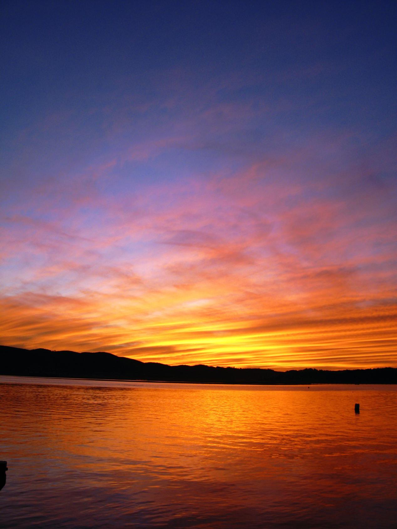 日落时天空颜色的变化是由大气中的分子发生瑞利散射造成的,这些分子比可见光的波长要小得多。灰色或白色的云是由水滴发生米氏散射造成的,水滴的大小与可见光的波长相当。图片来源wikipedia