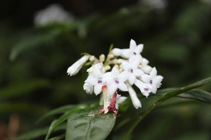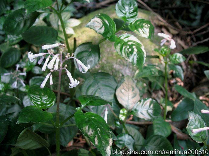 草本,高50-100厘米,除花序外无毛;茎和分枝均暗褐色或紫黑色,光亮,老枝近圆柱形,嫩枝稍扁。叶片纸质,卵形或狭卵形,长通常2-7厘米,很少达9厘米,宽1.5-3厘米,有时达3.5厘米,顶端骤尖,短尾状,钝头,基部楔形或阔楔形,全缘,上面灰绿色,下面苍白色;侧脉每边7-9条,弯成弧形,在下面凸起;叶柄长0.5-1厘米;托叶脱落。花序顶生,有花多朵,长3-5厘米,除总梗和分枝被短柔毛外无毛;花二型,花柱异长;短柱花:花梗长0.5-1.5毫米;小苞片丝状钻形,质稍厚,长4-5毫米,宿存;萼管陀螺状,长约1.5毫米,有5棱,萼裂片三角形,长0.7-1毫米,裂片间有腺体;花冠微红,稍带肉质,近管状,管长1-1.1厘米,喉部稍扩大,仅里面散生长柔毛,裂片5,卵状三角形,长1.5-1.8毫米,宽约0.8毫米,里面粗糙,背面有阔翅,翅成半月形;雄蕊5,着生在喉部稍下,花丝长0.5-1.5毫米,花药狭长圆形,长约1.5毫米;花盘筒状,几与萼筒等长,2裂;花柱长约5毫米,柱头2裂,裂片线状柱形,长约1毫米;长柱花未见。蒴果宽约8毫米,长约2.5毫米,紫色,无毛;种子有角。花期5月。