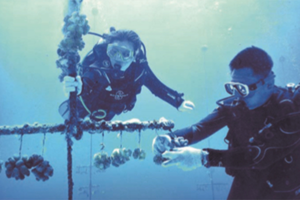 黄晖(左)在西沙群岛珊瑚修复现场