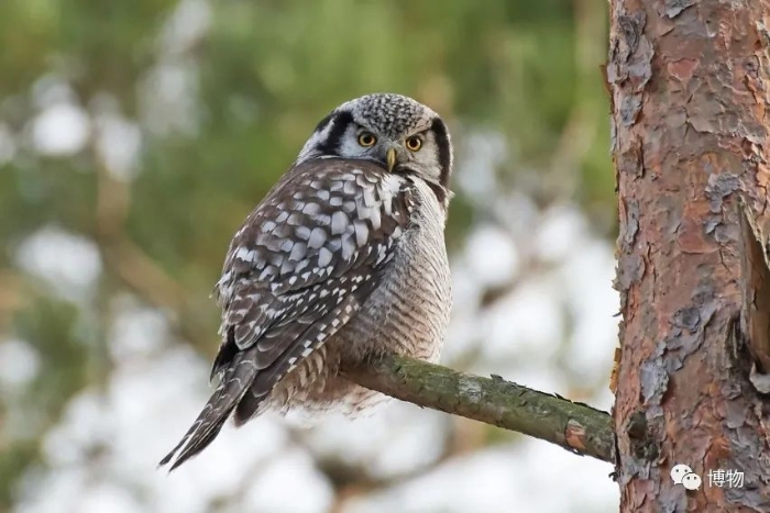 Devokaitis还有个猜测,猛鸮英文名“northern hawk owl”,“hawk”是鹰的意思,不知道它是不是鸮如其名,祖先就作风鹰派,像鹰一样白天活动。“因为在进化史的不同阶段,猫头鹰们都曾闯入白天。”