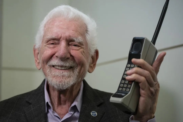 第一部商用手机的发明者马丁·库珀手持摩托罗拉DynaTAC 8000X。