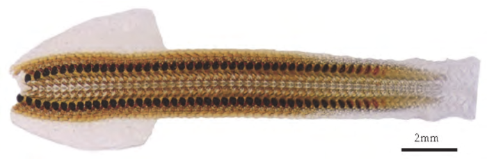 这是盖氏海胆石鳖(Acanthopleura gaimardi)的齿舌CT照,这些牙齿就像处于一个流水线上一样,随着从右到左的移动而逐渐加强矿化。
