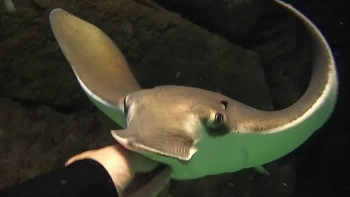 鹞鲼的吻部扁平而向前延伸的部分(饲养员用手抚摸的部分)即是头鳍,由胸鳍前端特化而成。©宮島水族館