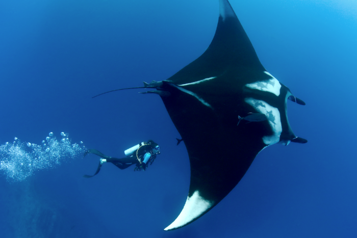 在双吻前口蝠鲼/Mobula birostris面前,即使是身材高大的潜水员也显得十分渺小。©marinemegafauna.org