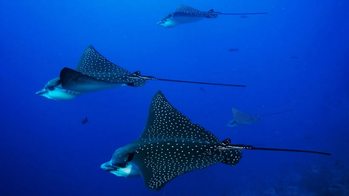 和大多数鲼形目物种不同,无刺鲼的尾基部并没有锋利的尾棘,上图中的为横纹无刺鲼/Aetomylaeus bovinus。© AILERONS