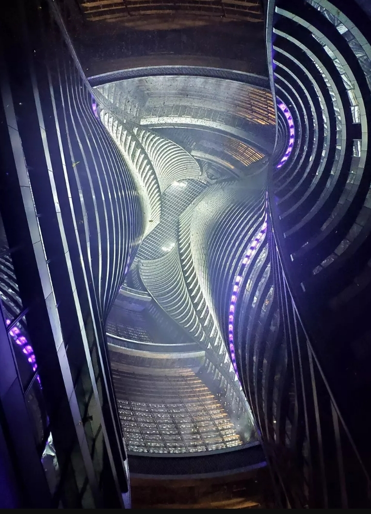 该设计最终形成独特的DNA双螺旋形态,不仅巧妙规避了地铁线路的限制,更创造了一项世界纪录——200米高的中庭空间,成为目前全球最高的建筑中庭。从建筑内部视角观察,垂直延伸的曲线空间营造出强烈的未来感,使参观者仿佛置身于太空电梯之中。中庭空间在自然光与人工照明的交互作用下,光影变幻丰富,宛若两条昂首腾飞的东方巨龙令人惊叹不已。