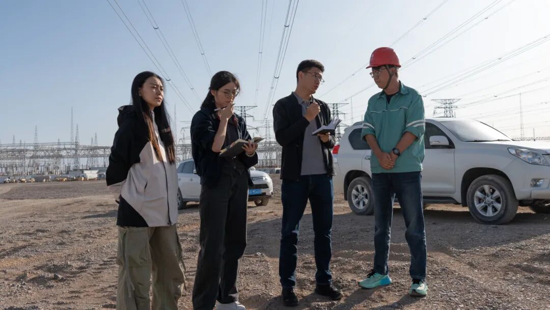 记者杨希(左一)、王晶(左二)、刘早(左三)在三塘湖北、淖毛湖750千伏变电站采访。摄影 / 马元