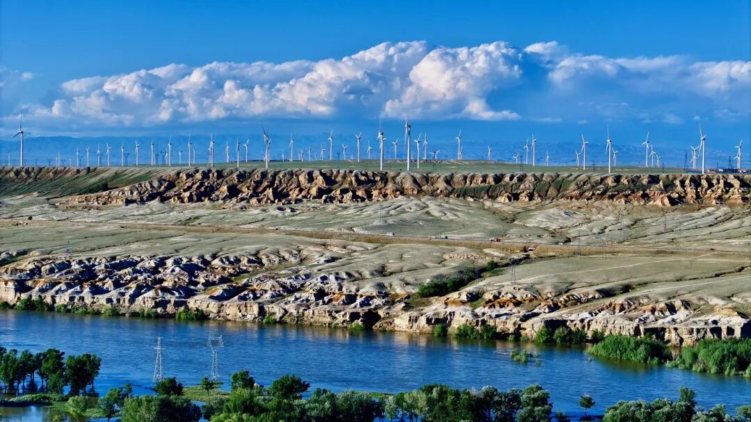 位于新疆阿勒泰地区额尔齐斯河河畔的五彩滩风电基地。摄影 / 努尔别克·努尔曼