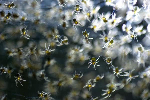 成千上万的小蜘蛛,拖着长长的蛛丝降落地面,就是传说中的蜘蛛雨啦。2015年5月,澳大利亚古尔本镇就下过蜘蛛雨。一夜之间,整个小镇就被无数蜘蛛空降兵们占领,闪亮的蛛丝包裹了一望无际的田野,人们简直像是走进了虫虫恐惧症患者的噩梦。