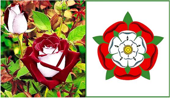玫瑰象征着甜蜜的爱情,娇艳而多刺的花朵,正如浪漫却易损的爱情。玫瑰向来是英格兰贵族的心爱之物。十五世纪中后期,白玫瑰家徽的约克家族和红玫瑰家徽的兰开斯特家族,爆发了史称“红白玫瑰战争”的英格兰王位争夺战。惨烈内战以妥协而告终,英国王室徽记上出现了外红内白的都铎玫瑰,玫瑰也从此成为英格兰国花。