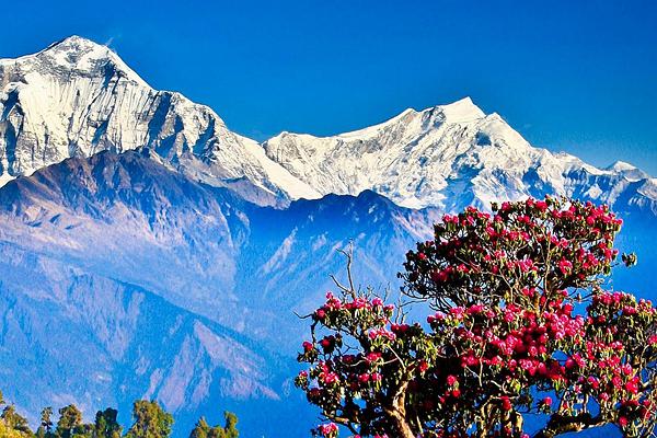 在喜马拉雅山脉南麓的山国尼泊尔,自然生长着众多绝美的珍稀杜鹃。尼泊尔人民把杜鹃花视为国家的象征,还采撷杜鹃花瓣制作富有当地特色的美食。每一天的春天,尼泊尔原始山林中的杜鹃花树次第盛开,在皑皑雪峰之下形成壮观的红色花海。为了重现这种梦幻般的美景,尼泊尔国徽上绘有红色的杜鹃花环,围绕着一座雄伟的喜马拉雅雪山。