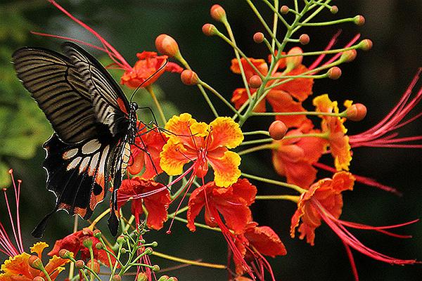 作为一种栽培广泛的热带灌木,金凤花的花簇有着热烈奔放的风格。金凤花拥有五片艳丽的花瓣,花朵中心呈现漂亮的橙红色,花瓣边缘却像黄金一般璀璨闪亮。配合以十个长长的红色花蕊,一朵朵迎风怒放的金凤花,就像是一只只翩翩起舞的彩蝶。
