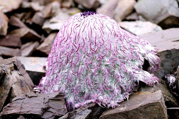 严寒缺氧的高原山地,是绝大多数植物的生命禁地,却是水母雪兔子唯一的家园。这种菊科风毛菊属的珍稀植物,只生长在亚洲中部海拔3000米以上的流石滩上。带有紫色条纹的长长柔毛,覆盖着水母雪兔子全身的茎干和草叶。远远看去,它们既像是一个个奇特的彩色水母,又像是一只只匍匐在石头上的小兔子。