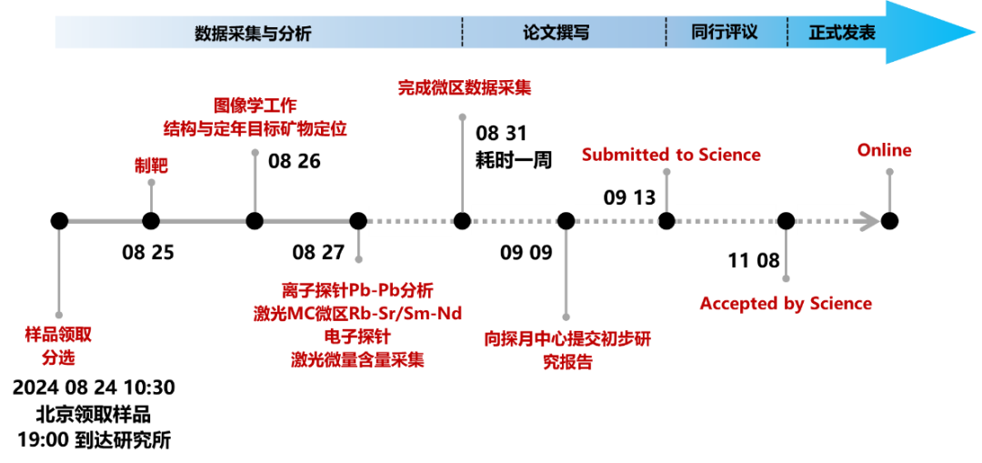 图14展示了广州团队在拿到样品以后大致的工作流程。样品于2024年8月24日上午10:30发放,到达广州地化所已是19:00,相关工作马上开始展开。8月25日完成样品前处理,8月26日进行图像学处理,找到目标分析对象。一周内完成所有微区的数据采集工作。9月9日,向国家航天局探月中心提交了一份研究报告,成为最终向国家领导人汇报的依据。北京团队和广州团队分别于9月7日和9月13日将研究成果投到了《自然(Nature)》和《科学(Science)》期刊。最终两篇研究论文均于11月15日在线发表。