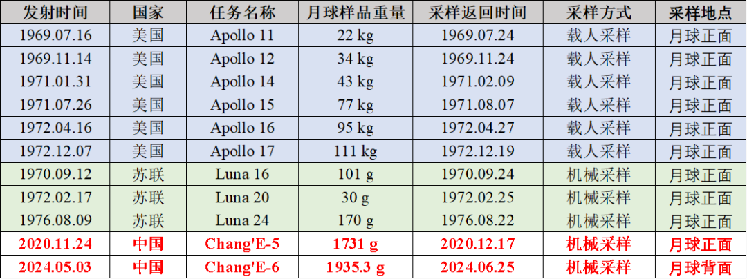 太空竞赛期间共有9次成功返回月样,其中阿波罗6次载人登月返回了382公斤的月球样品,苏联“月球计划”3次机械采样分别带回101克、30克和170克月样(表1)。