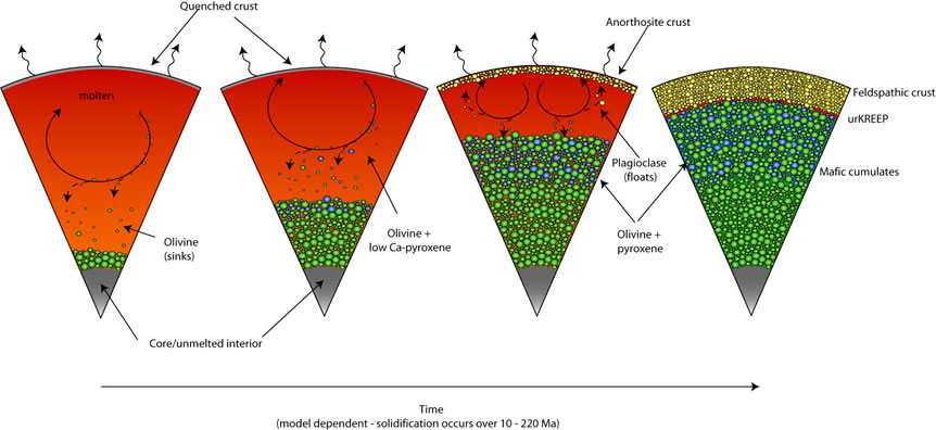 撞击后的熔融物质汇聚成一个岩浆火球,即月球岩浆洋,随着岩浆的冷却,重的矿物(橄榄石、辉石)沉入岩浆洋底部,而轻的矿物(斜长石)则上浮至月球表面,形成灰白色的月壳。岩浆洋假说奠定了月球演化的起点。