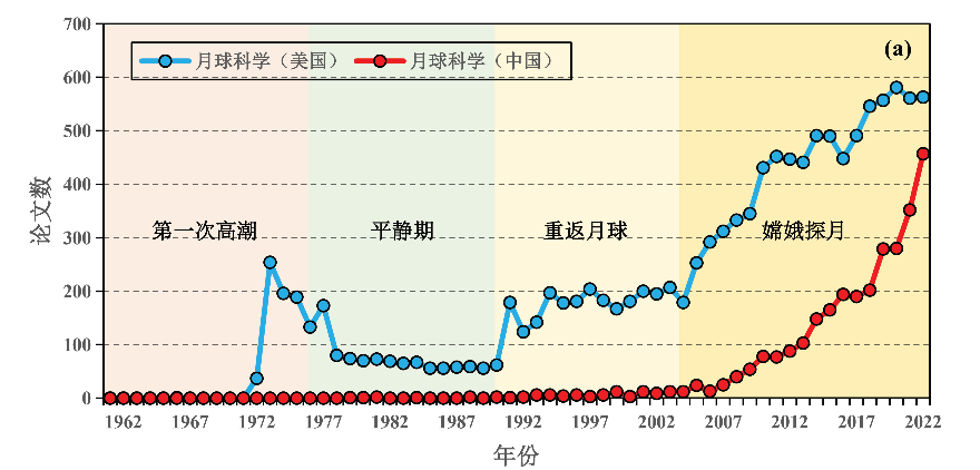 1962-2022年中美两国月球科学发表论文数对比