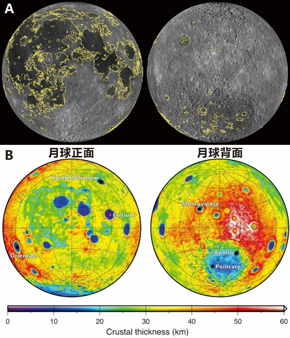 (图片来源:图A引自Lunar Topography Lithograph;图B引自Wieczorek et al., 2013, Science)