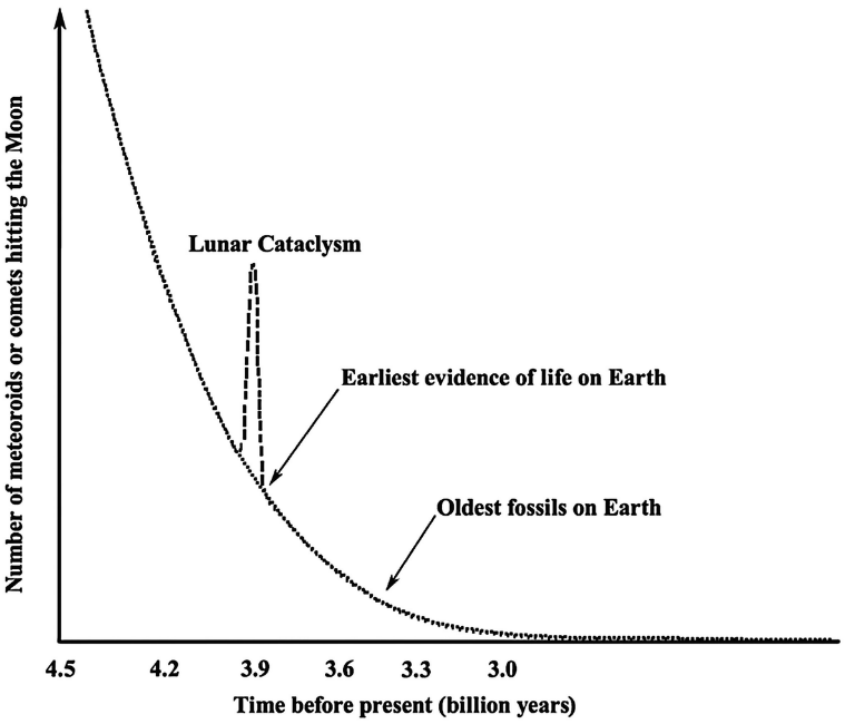 月球遭受陨石或彗星撞击的通量,图中的凸起即为“月球大灾难”,也被称为“晚期重轰炸”。
