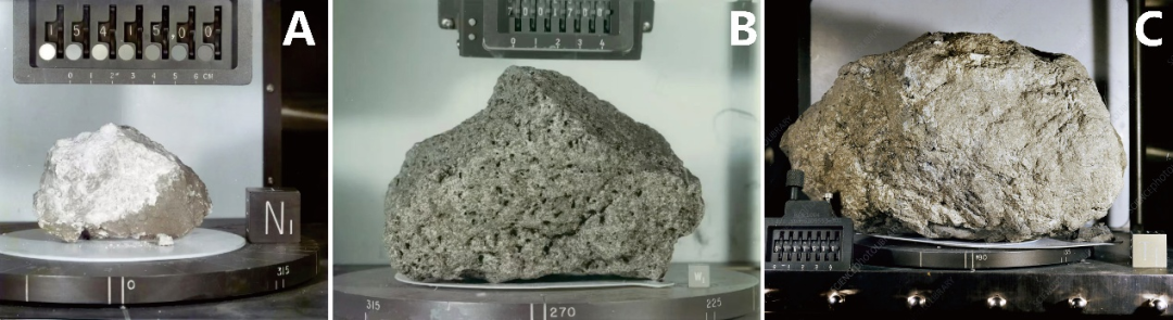 月球三大类岩石。(A)Apollo 15号采集的高地斜长岩,样品编号:15415,该样品被称之为Genesis Rock(创世石);(B)Apollo 17号采集的月海高钛玄武岩,样品编号:70017;(C)Apollo 16号采集的月球角砾岩,样品编号:61016,该样品被称之为Big Muley,是月球角砾岩样品中最重的一块(11745克)。