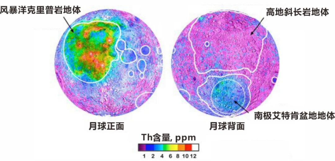 科学家通过遥感数据,对钍(Th)元素进行探测以后,提出月球三分地体的假说。正面的风暴洋地区具有最高的Th含量,约为6-8ppm,即一千克月壤含有6-8毫克的Th元素。月球高地具有最低的Th含量,不到1ppm,而南极的艾特肯盆地介于两者之间。三分地体对应的风暴洋克里普岩地体、高地斜长岩地体和南极艾特肯盆地地体也是我们开展研究时非常重要的地质背景。
