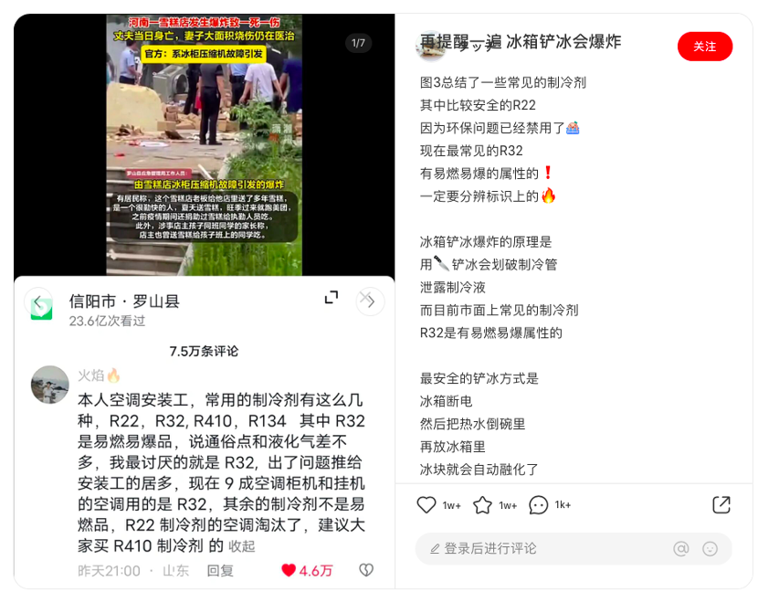 有网友猜测,可能是因为给冰箱铲去多余的冰时,发生了爆炸,并给大家普及了一些制冷剂安全的知识。