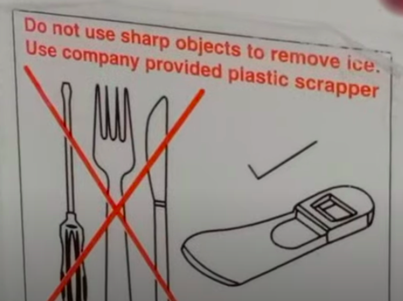 冰箱上的标识:不要用尖锐的物体除冰,而要用附赠的塑料铲丨youtube/Forever Tech English