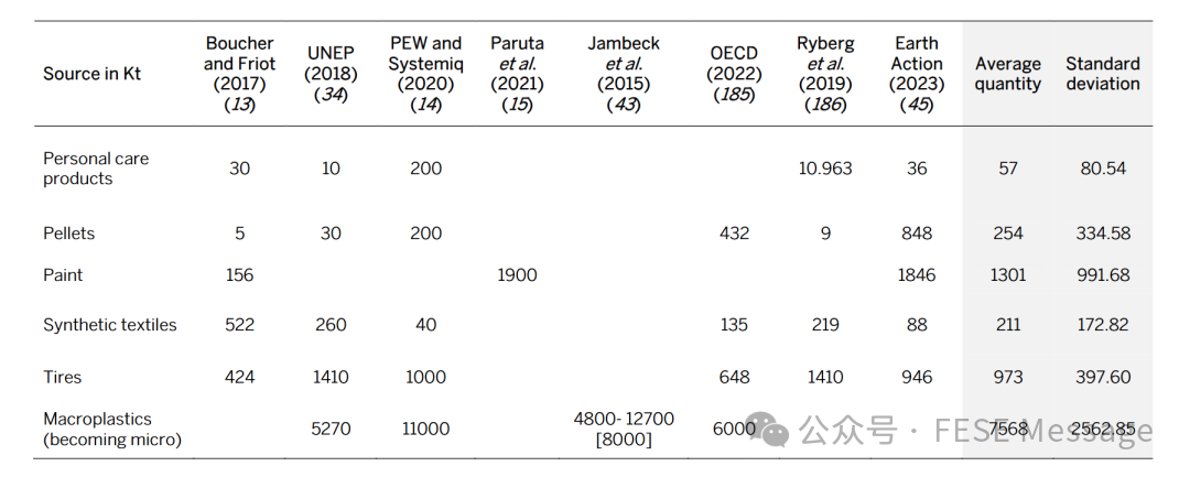 表1. 每年进入海洋环境的微塑料估计量。主要来源及其以千吨(Kt)为单位的相对贡献量。这还包括最终会破碎成微塑料的宏观塑料,其贡献以每年典型的海洋泄漏量来表示。请注意,每项研究使用的方法不同,在可能的情况下,数据范围会列出,括号内为中间值,图2B使用了平均值和标准差。