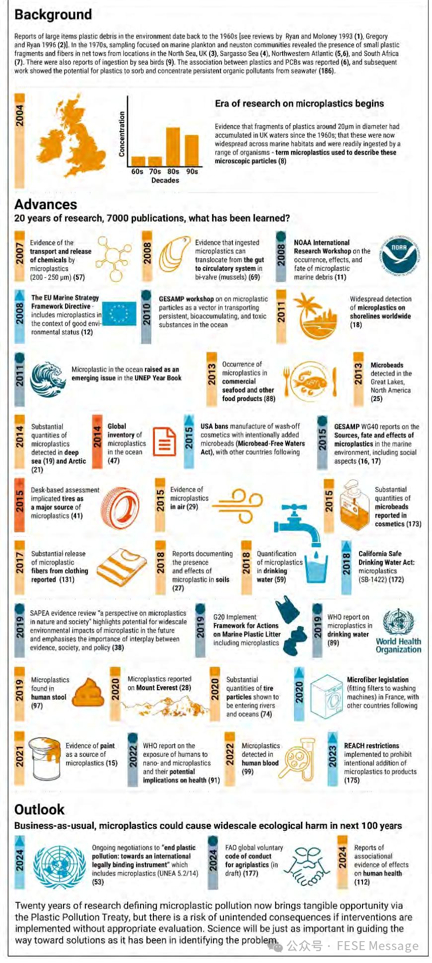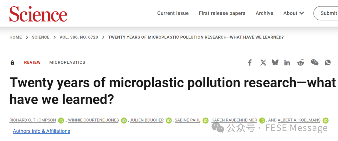 2004年,英国科学家Richard C. Thompson等人在发表Science论文,首次提出“微塑料”的概念,20年后的2024年9月,英国普利茅斯大学的Richard C. Thompson等人以《Twenty years of microplastics pollution research—what have we learned?》为题发表于*Science*期刊,文章回顾了微塑料污染研究20年的成果,涵盖其定义、来源、环境影响、对人类健康的风险、研究方法、相关政策等内容,并探讨了未来研究方向和应对策略。
