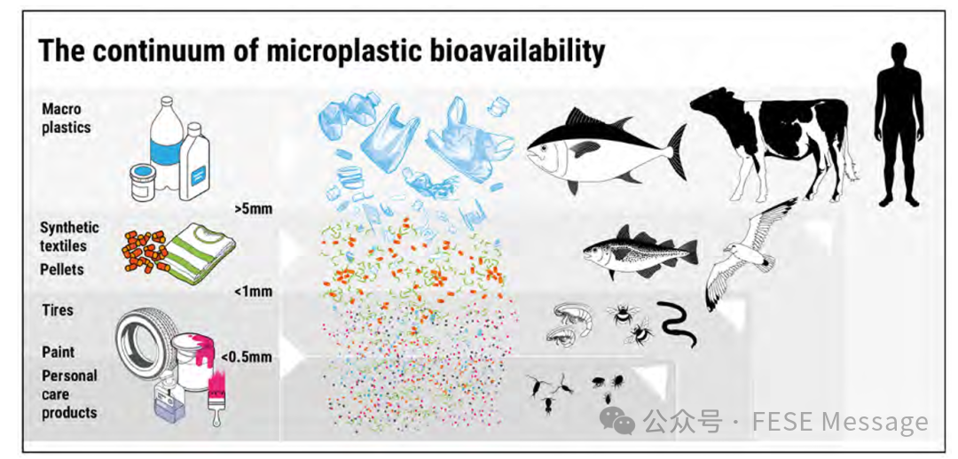 ▲图3 塑料和微塑料的生物利用率,根据尺寸和主要来源。随着塑料制品分解成越来越小的碎片,它们变得可以被更广泛的生物(水平行向下)利用,并且沿着食物链传递的潜力也增加(对角箭头)。