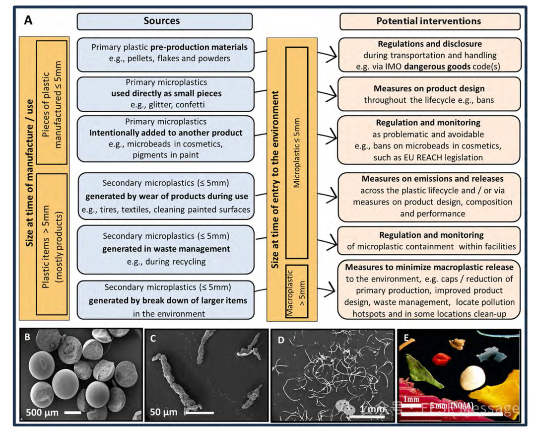▲图1 微塑料的分类和来源。(A)根据来源和尺寸提出的微塑料分类的方案图,以及潜在的干预措施。(B-E)各种微塑料类别的图像:来自化妆品的微塑料微珠,原生微塑料的一个例子(B);来自汽车轮胎的颗粒物(C);从纺织品释放的纤维(D),这两者都是由磨损产生的二次微塑料,以及在环境中碎裂产生的微塑料(E)。(E)中的比例尺与微(<1mm)的国际单位制定义及美国和欧盟政策制定者对微塑料的尺寸定义(≤5mm)相关。