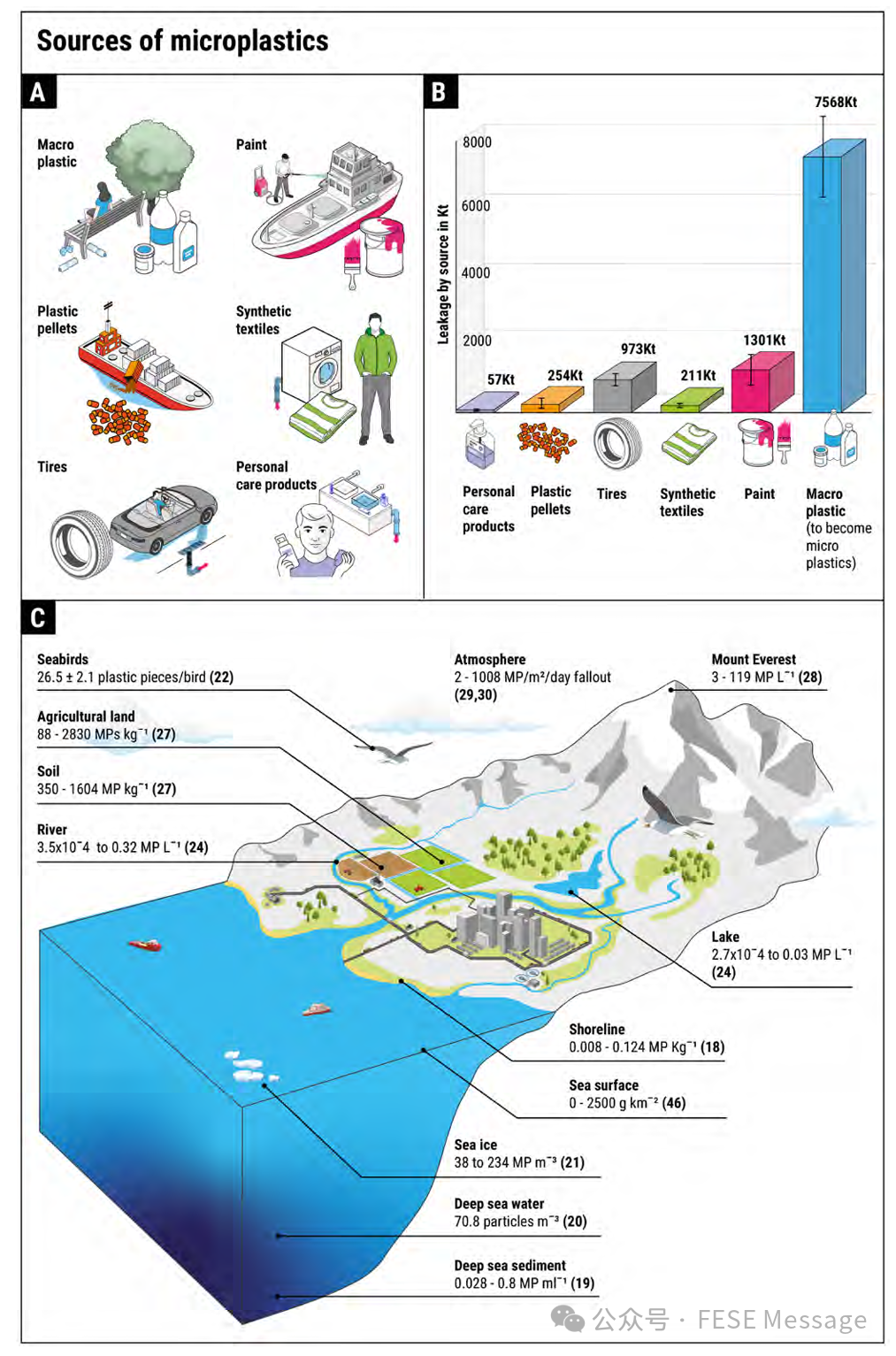 图2 微塑料在环境中积累的来源和途径。(A)导致六个关键微塑料来源的人类活动;(B)每个来源对海洋环境的相对贡献,以及(C)报告在各种环境区块中的数量。