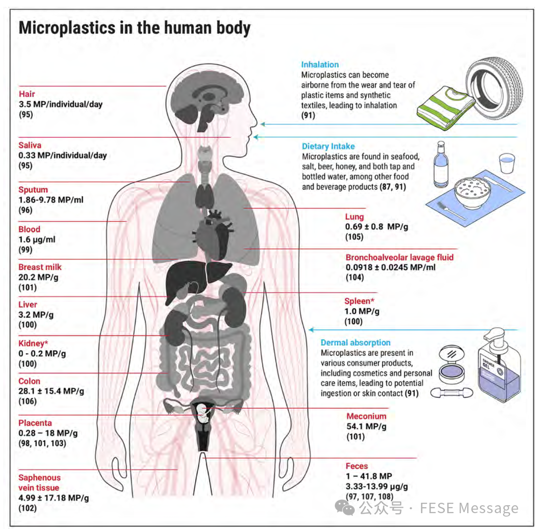▲图4 报告微塑料存在的人体部位。显示暴露途径(青绿色标签)和报告的数量(红色标签)。数量按照每项研究的报告,未进一步进行质量保证/质量控制筛选。应谨慎进行跨研究比较,因为各研究之间的报告方法和单位存在差异。由于一些方法未对个体颗粒进行特征化,因此按质量报告的数量可能涉及微塑料和/或纳米粒子。*报告的数量约为检测限。