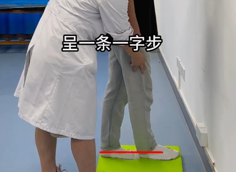 双脚并拢站立,双手自然放于身体两侧,一脚向前迈出,脚跟与另一脚脚尖呈一条直线,双脚交替向前沿直线行走。如不能保持平衡,可抓住家人的手练习。
