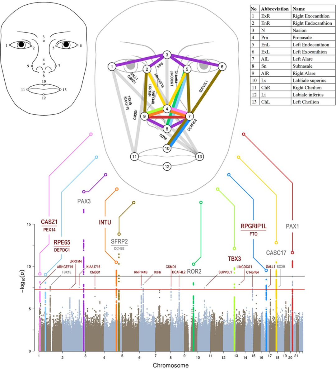 不仅是五官的细节特征,面部的立体感和五官的整体比例,其实也早已写在基因里。2019 年的一项研究通过对上万名欧洲人的 78 个面部特征进行分析,从中提炼出 13 个关键点,并最终锁定了 24 个相关基因。