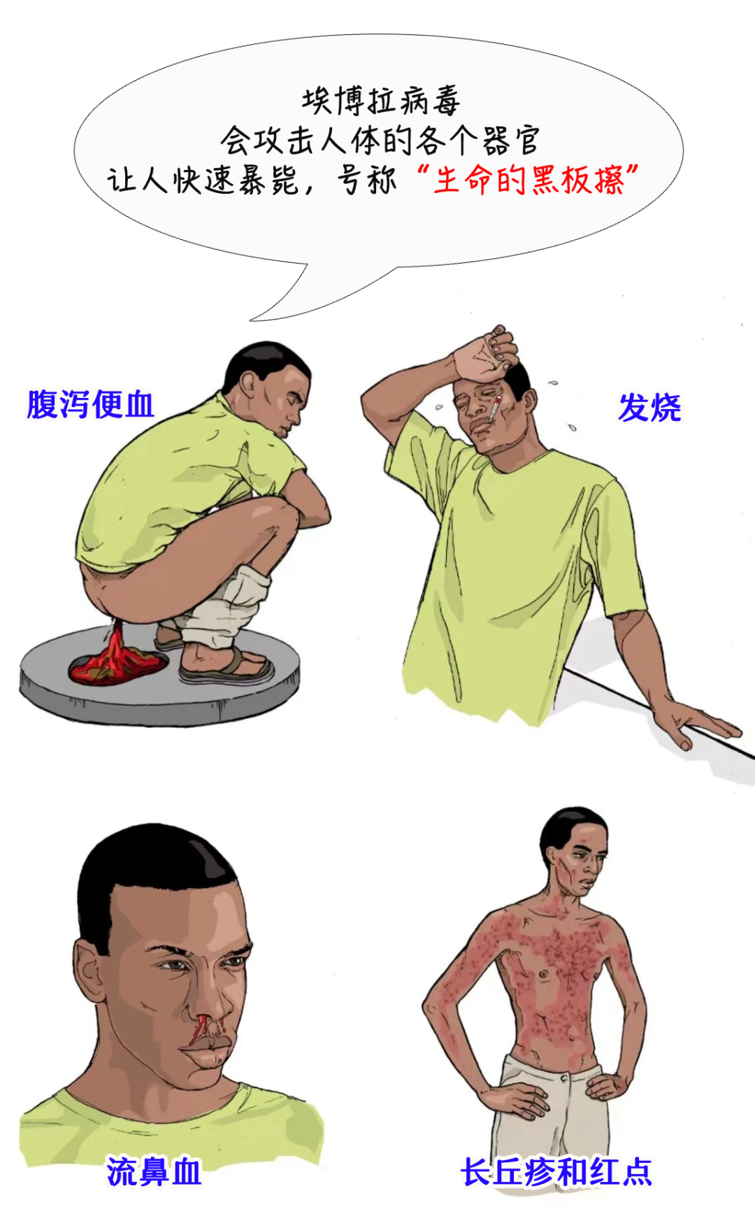 ▲埃博拉感染者(来源:《埃博拉的故事》)按照埃博拉病毒感染的常见症状,胡玛尔立刻在院内找到这两名患者