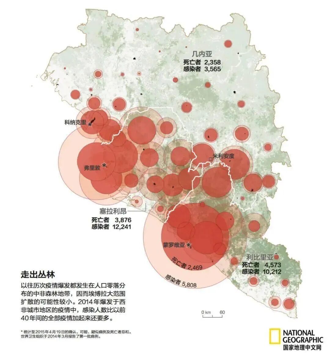 2014年西非疫情示意图:深红色圆代表死亡患者数,浅色代表染病患者数(图源:见水印)