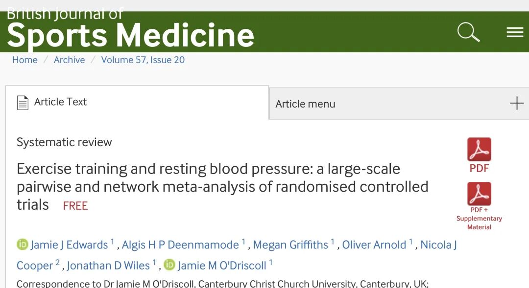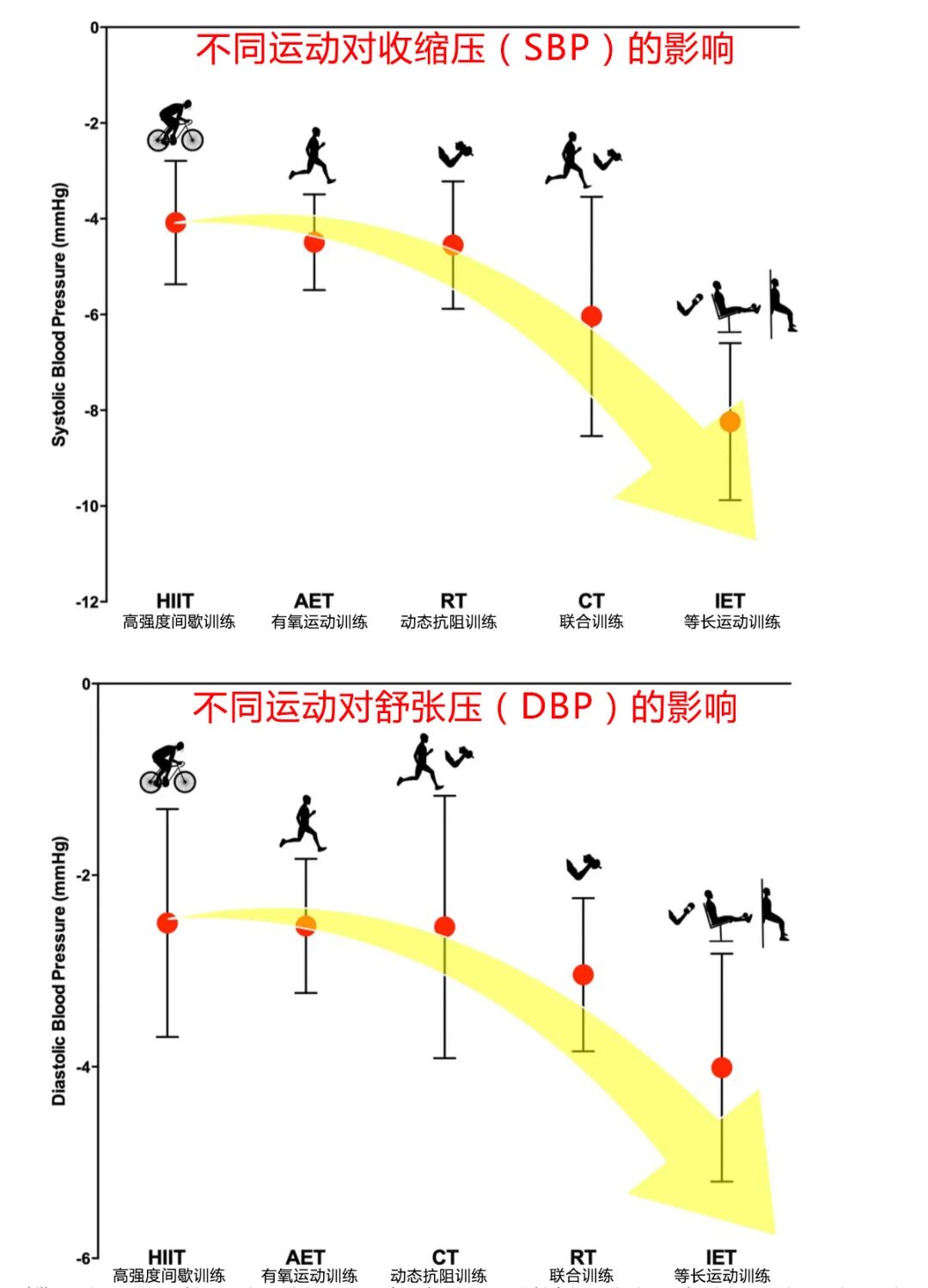 该研究分析了270项随机对照试验,纳入了15827名参与者,通过对高强度间歇训练、有氧运动、抗阻运动、有氧阻力联合训练、等长运动等分析后发现:所有类型的运动都有助于降低静息收缩压和舒张压,但等长运动的降压幅度最大。