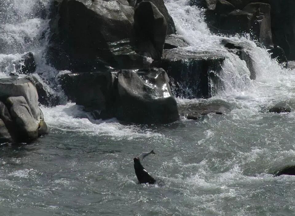 追寻猎物足迹确实是影响加州海狮分布的一个重要因素。位于俄勒冈州的博纳维尔大坝(Bonneville Dam)和威拉米特瀑布(Willamette Falls)距离最近的入海口有一百多公里,但一群加州海狮每年都会追随洄游的鲑鱼逆流而上。聚集在水坝下等待鱼梯的鲑鱼遭到海狮大肆洗劫,一些鱼群的规模至少缩减了25%。同样的故事造成了更严峻的后果——加州海狮直接就把华盛顿湖的硬头鳟给吃绝了。