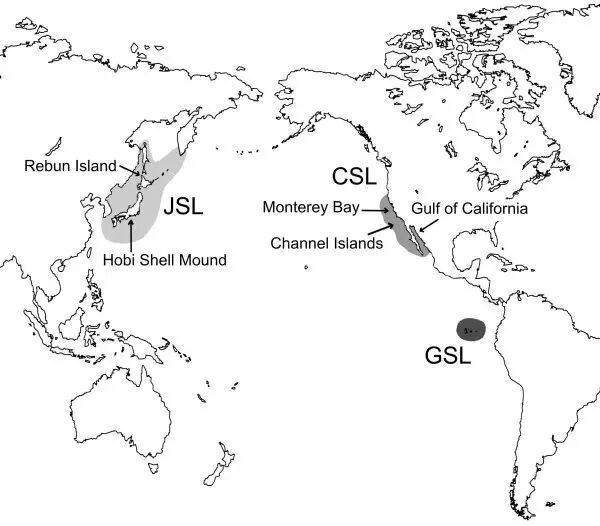 加州海狮(CSL)、加拉帕格斯海狮(GSL)和日本海狮(JSL)的分布范围丨Jochen BW Wolf et al. / Frontiers in Zoology(2007)