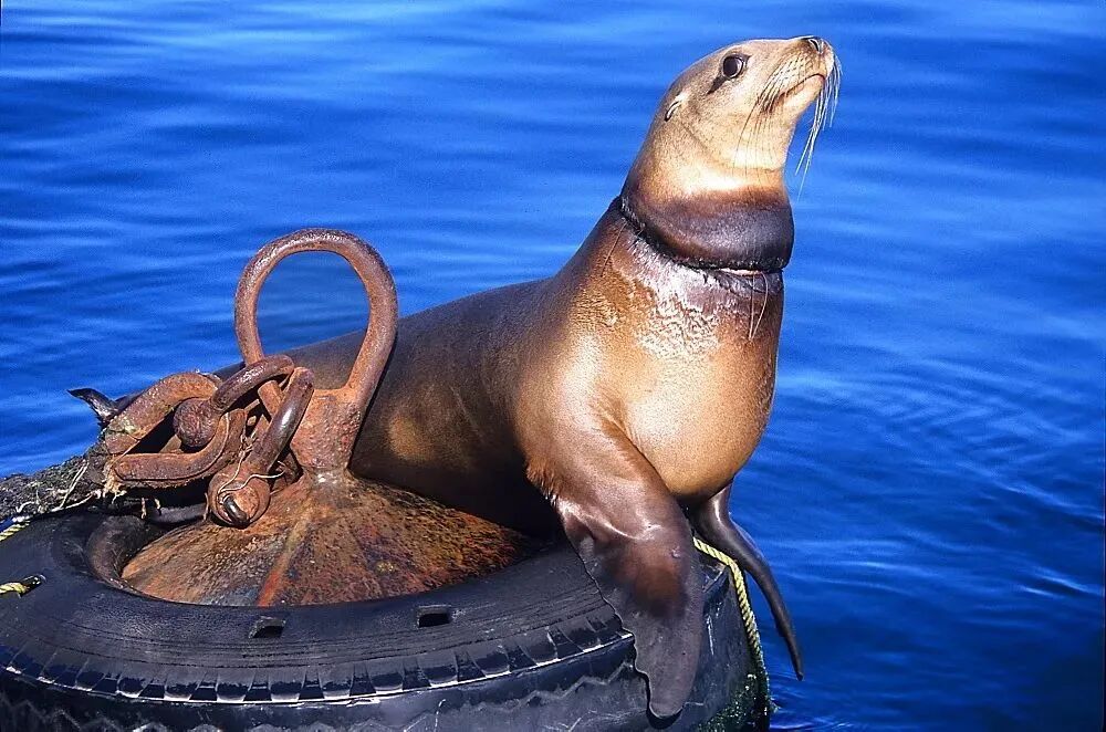 被鱼线缠绕在脖子上的加州海狮,和那些直接被渔网窒息致死的同类相比,顽强的它还算幸运丨robertharding.com