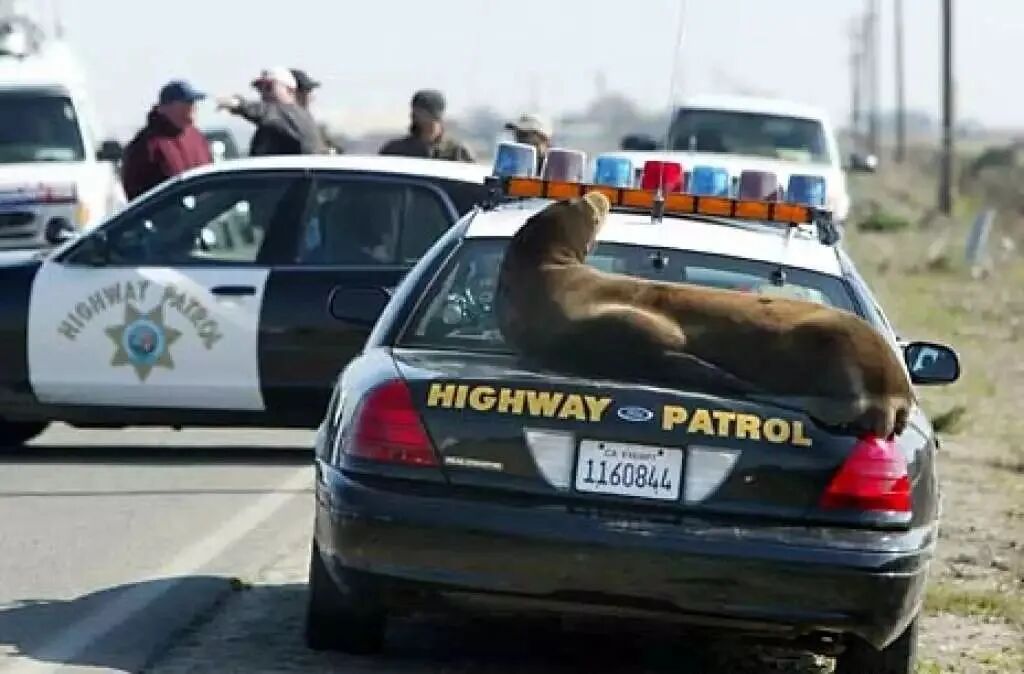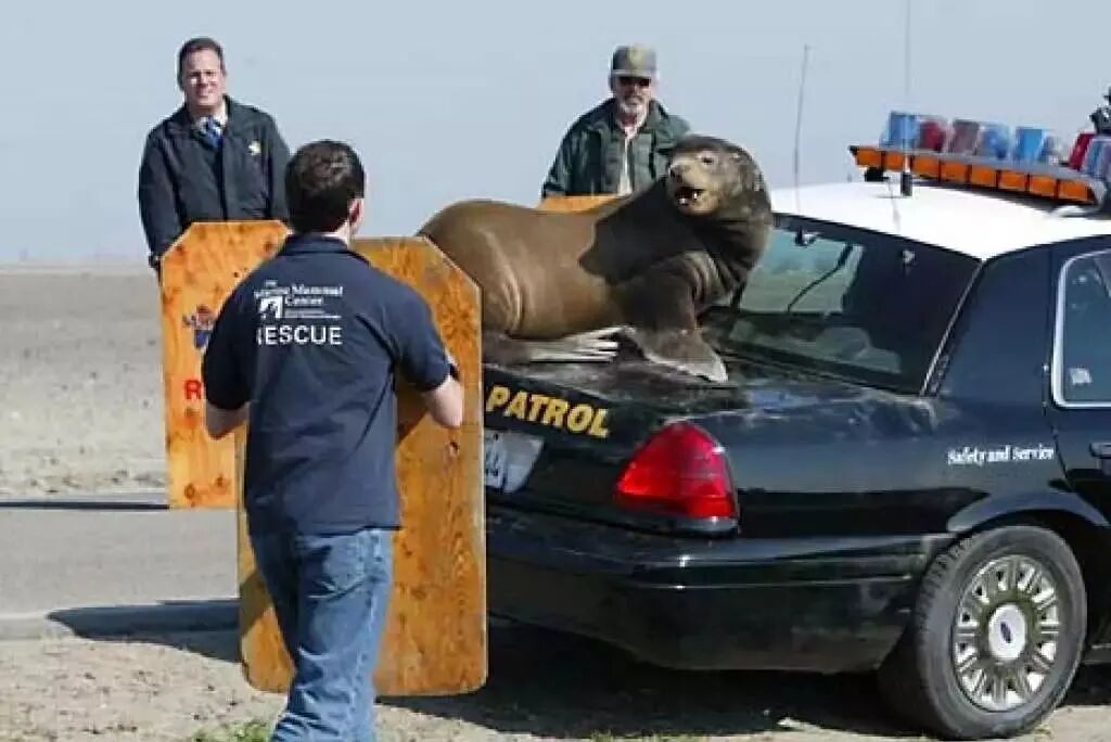 人们推测,这头海狮沿着圣华金河(San Joaquin River)至少逆流而上一百英里,又沿着灌溉水渠深入内陆。或许是找不到返乡的路,心大的海狮干脆登陆上岸,甚至还在赶来救援的警车后备箱上晒起了太阳。
