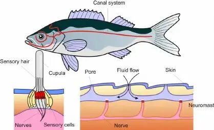 它分布在鱼的表皮和管道内,内部的毛细胞对水流位移和0到200赫兹的低频压力梯度极其敏感。每条鱼身体周围存在一个物理排斥区,当有邻近物体靠近时侧线系统会触发回避反应。