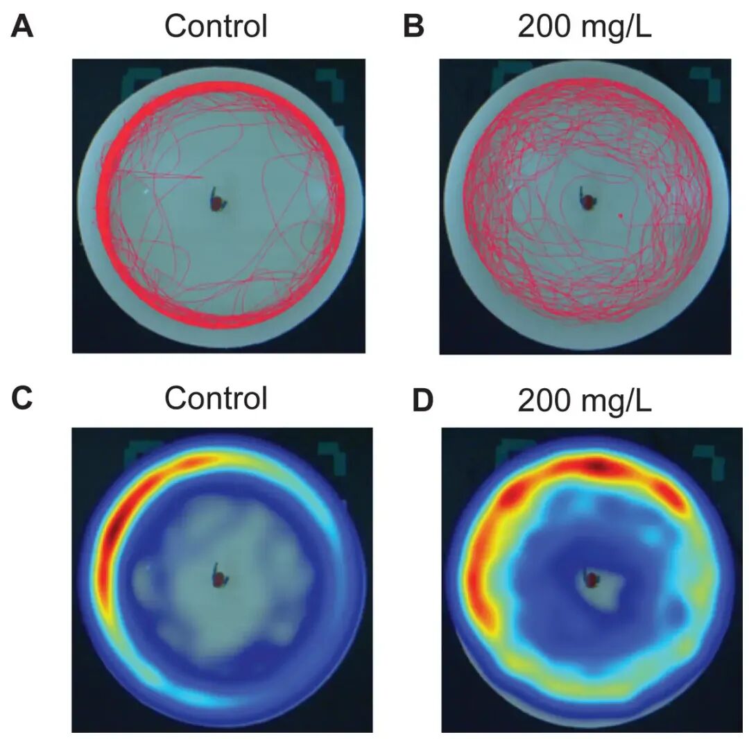 下图图 A中,红线代表一条正常的鱼(对照组 Control)在被放入陌生的圆形水箱后的游动轨迹。你可以看到,它几乎像个扫地机器人一样,死死贴着最外圈的边缘游动,水箱的中心区域对它来说仿佛是“禁区”。