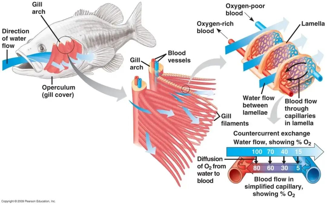 鱼依靠鳃呼吸,鳃丝上密布毛细血管,水从口腔进入,流经鳃,再从鳃盖排出。鱼鳃内部血液流动的方向与水流的方向完全相反,这种机制叫逆流交换[2](下图)。
