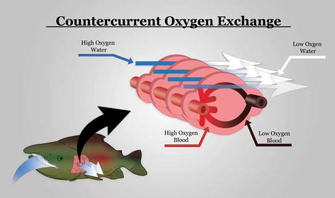 逆流交换确保了含有较少氧气的静脉血接触含氧量较低的水,而动脉血接触刚入口的含氧量最高的水,从而维持完整的氧气浓度梯度,实现最大化氧气提取。