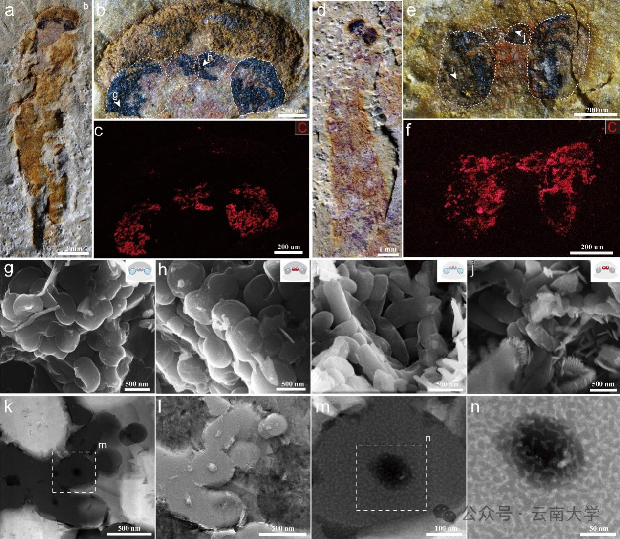 澄江生物群中两种昆明鱼类的相机型眼(虚线显示,a–f)、黑素体形态(g–j)以及超显微结构(k–n)来源:云南大学